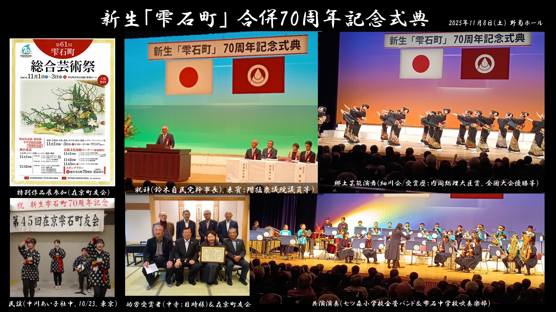 「新生雫石 町合併70周年記念式典 」 が11/8(土)昼より雫石町野菊ホールにて開催されました。 来賓として自民党幹事長の鈴木俊一様、立憲民主党の階猛様はじめ郷土ゆかりの多くの衆参両議員や県知事、県議会議員の皆様の来賓を頂き、我々在京町友会の役員幹事もお招き頂きました。鈴木俊一様のご祝辞の後、郷土芸能伝承部門で全国大会優勝や総理大臣賞など多くの受賞歴のある「細川会」による芸術的な演舞の数々、七ツ森小学校と雫石中学校の感動的な共同演奏など、見事な式典となりました。式典事前の総合芸術祭2025含め、お世話になりました実行委員会や関係各位に心より御礼申し上げます。