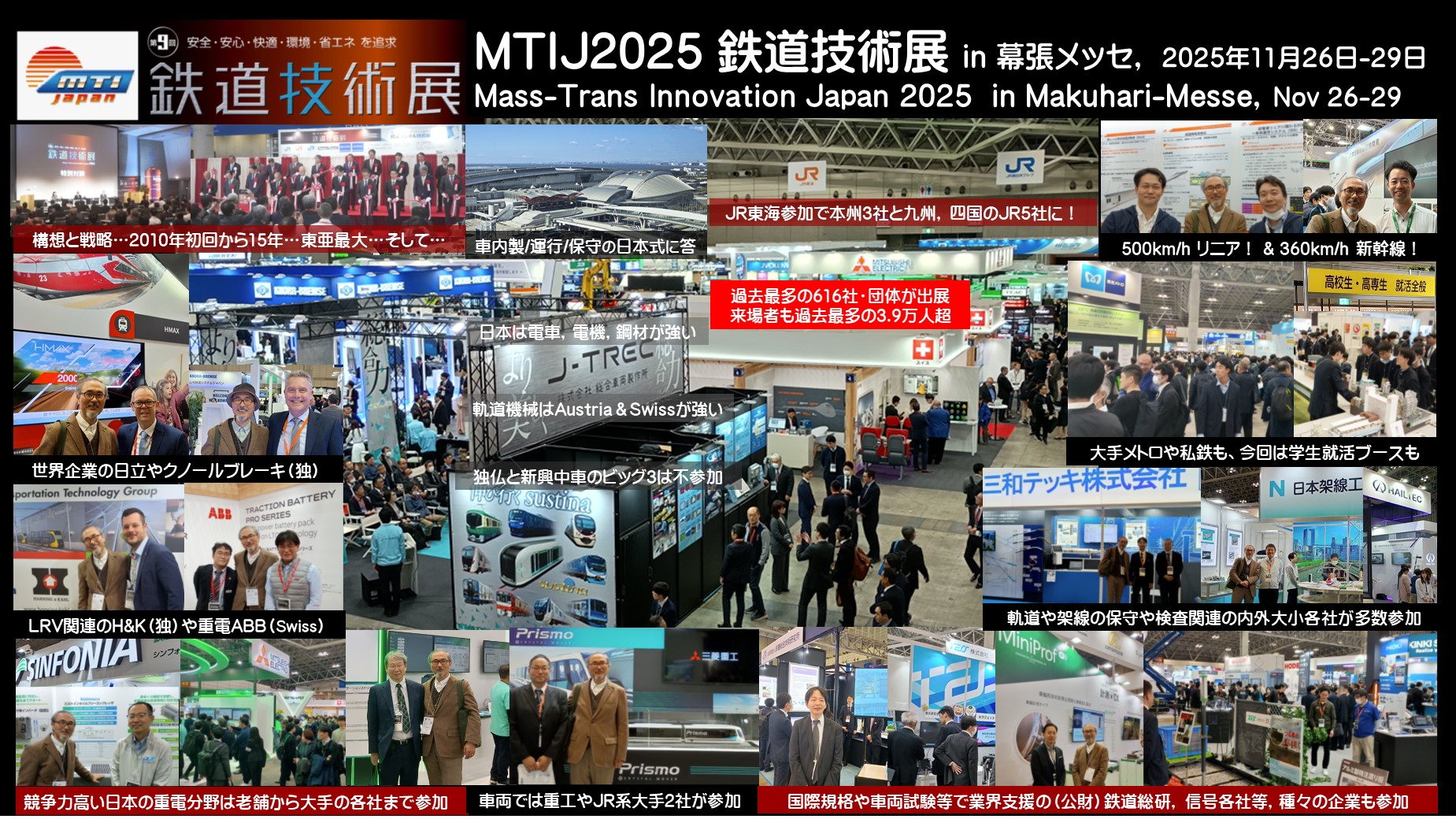 『第9回鉄道技術展 MTIJ2025 (Mass-Trans Innovation Japan 2025)』が2025年11月26日(水)~29日(土)の4日間、幕張メッセで開催されました。今回はJR東海の初参加で本州JR3社に九州・四国も参加など、過去最多の616社・団体が出展し、来場者も過去最多の3.9万人超となりました(概要組写真:jpg,pdf)。また、休日となった最終日には、働くお父さんを観に家族も来場。欧州的な現代社会の微笑ましい光景に、鉄道技術展の持つ多面的な可能性の一面を感じ取りました。技術展に参加されました鉄道産業界関係各社と主催者に対し、これまでの発展の努力に一老鉄道技術士として感謝申し上げます。